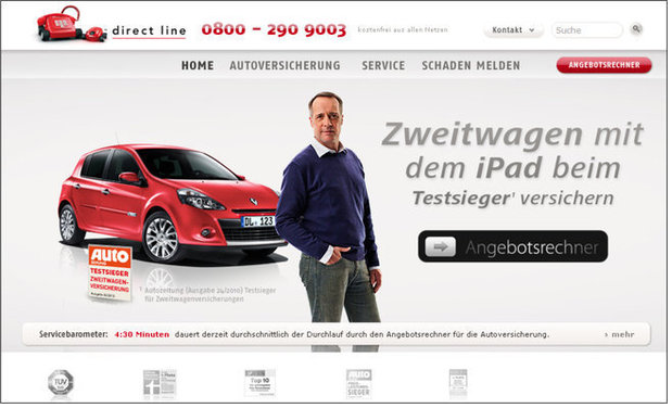 在多螢時(shí)代,網(wǎng)絡(luò)營(yíng)銷必須通盤(pán)考量各種平臺(tái)。因此,不論是pc版或移動(dòng)版網(wǎng)頁(yè)上的按鈕,都必須一樣醒目、好操作。英國(guó)保險(xiǎn)公司 Direct Line 的 iPad 網(wǎng)頁(yè),就讓按鈕以平板裝置消費(fèi)者習(xí)慣的滑動(dòng)方式來(lái)運(yùn)作(如下圖)。